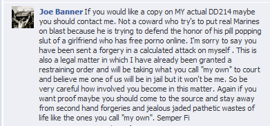 Dude, nice try. We were in Lima Battery with you. You were a cannon crewman the whole time. You're trying to act like the fact that you have a combat action ribbon makes this all true. And nice fake tramp stamp that you're stuck with the rest of your life with scuba and wings on it. When the fuck did you get two purple hearts? Face it, dude. You made up a shitload of lies and now you are trying to act like you're gonna sue over it. God, I would be so embarrassed if I was you. What a fraud.
