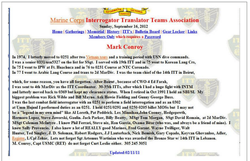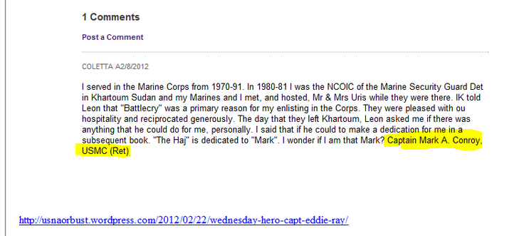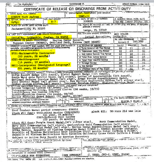 I worked with then GySgt Mark Conroy at 4th MarDiv, and he was filling the 0369 MOS due to the fact that he lost his clearance, he was also tossed in to Alcohol Rehab during his time there, I knew this because I worked in the CG’s office and his paperwork came across my admin chiefs desk. It was the CG that had to approve his being sent to rehab due to previous incidents that had taken place with his behavior. Gy Conroy was also partially responsible for the death of a Marine at 4th MarDiv when out on a night of drinking they broke down and he had SSgt Harris walk the highway to get help to assist their disabled vehicle, Harris was hit by a car and killed instantly and Conroy was still sitting in the vehicle when law enforcement arrived. He was never very dependable, and MGySgt Wible whom was our G-2 Chief held Conroy in complete disdain from the previous experience he had encountered with Gy Conroy. He wore a ton of ribbons back then and I am surprised that something wasn’t said at the time, he worked for a Navy Cross awardee Colonel Merlin Sexton whom was our G-3.