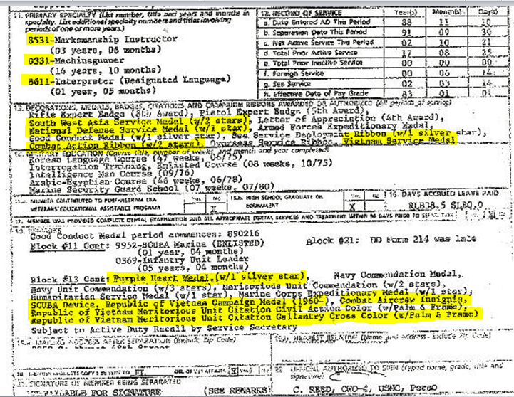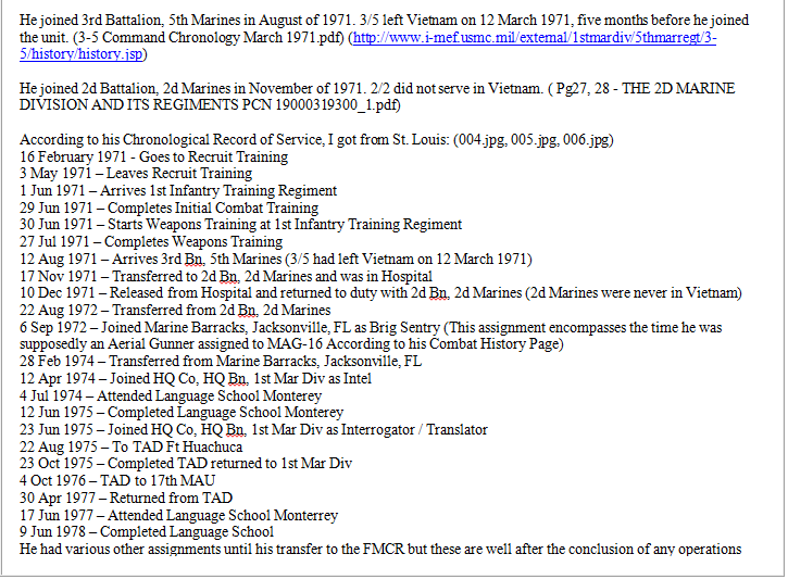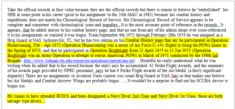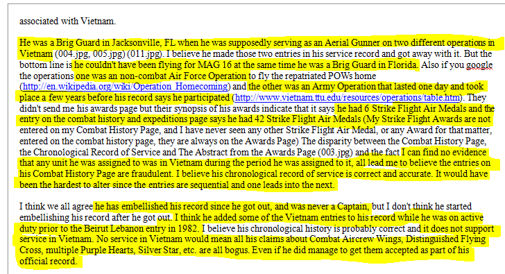 At one point, I read that he claimed one or two Purple Hearts from his Beirut tour, which I know for a fact was a lie. There were 11 of us who went to Beirut in Oct 83 and returned together in 84, and NONE of us was wounded there.