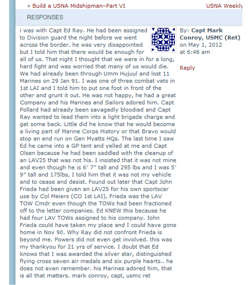 As for his retiring as a Captain of Marines, I retired in 87, when Mark was apparantly still in New Orleans with the 4th Marine Division HQ. He gave me hs BS about his battlefield promotion from GySgt to Captain and how it came about. Well, personally I don’t believe a word of it. I have known a couple of folks who received battlefield promotions, and they went fromenlisted to 2nd Lt, NOT enlisted to Capt. And I REALLY doubt that he would be promoted and made a Company Commander (His words) when there were other officers available to fill the slot- Plt Commanders, S-3 personnel, etc. Just too much of a stretch for me to believe.