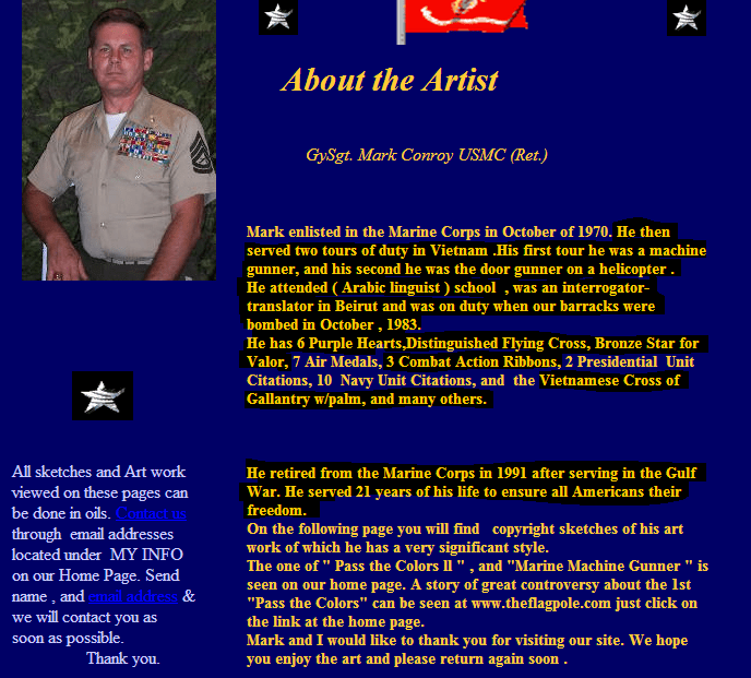 After a couple of us disputed his profile on the Together We Served web site, he called me one evening threatening me with a lawsuit and even threatened to kick my ass. He, at 5’9″ and 175, and me at 6′ and 220, of course I was totally in fear of him- chuckle. He also spouted a bunch of untruths regarding my personal background, which I can produce witnesses to the real facts- not Marks vision of things.