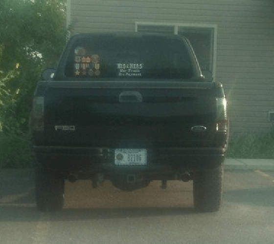That is a lie. I personally know the person who took those photo's . He also was inside of Hay's house and saw his wall of shame full of fraudulent awards and certificates. It was my buddies wife who altered him to this pickup. Because she saw it driving around town with these stickers in the back glass. The stickers weren't removed until after Hay's was exposed here and on This Ain't Hell. Wanna try this again Ms Christina ?