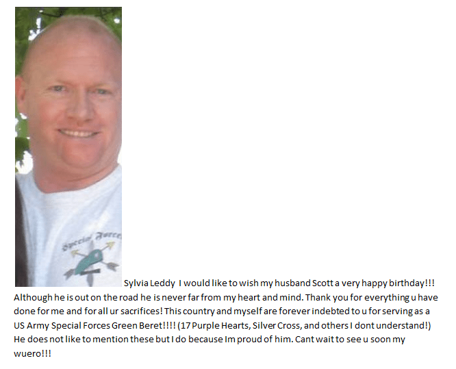 I'm Craig Wilson, Paige's brother and retired member of 10th SFG. Thank you for the work you do to expose posers like this POS Scott Leddy. I told Paige that these dumbasses have no clue that there's a worldwide network of brothers dedicated to find the truth and busting them.