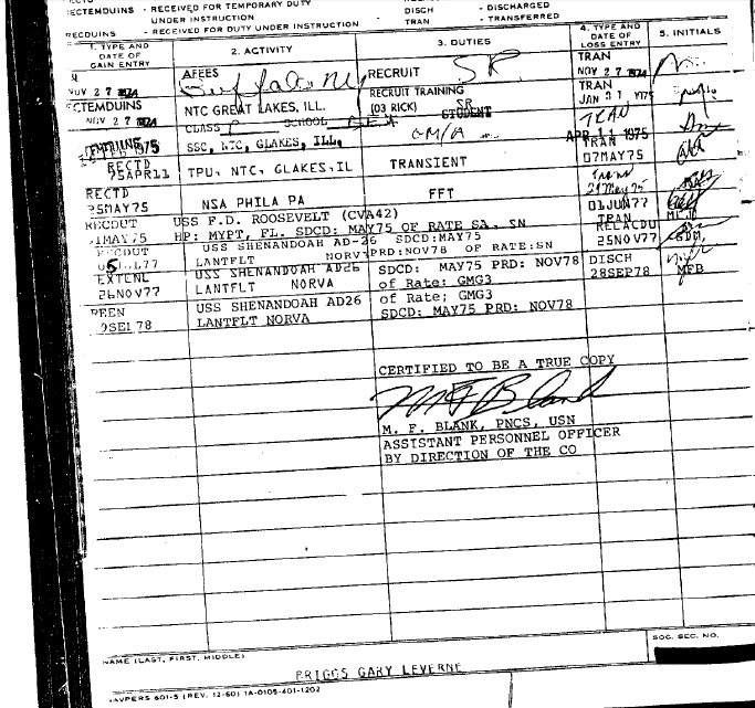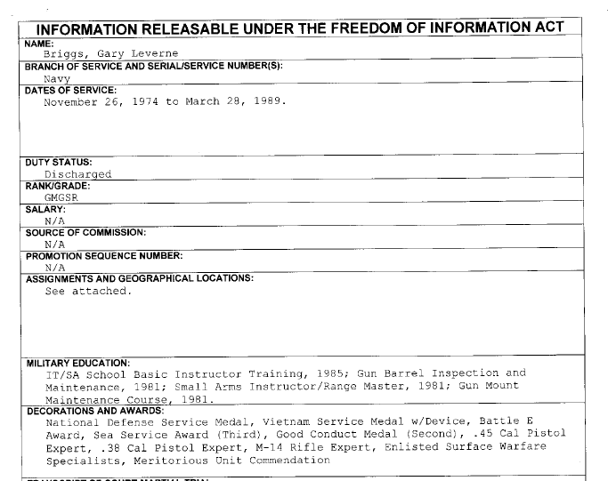 I knew Gary Laverne Briggs while a CPO at FTC Norfolk, one of his last duty stations. He wore Vietnam service ribbons on his uniform that I questioned then. His downfall there included Stealing a Lt's uniform, using and wearing it for obtaining credit and other stuff. A long time ago and a little hazy. But I vividly remember him sitting at my desk minutes before his Captains Mast blubbering like a baby. I finally had to tell him to buck up, be man, and go face the music. I also think I had to visit him in the brig once or twice. He was an accomplished Bullshitter then, A poser? Yep .