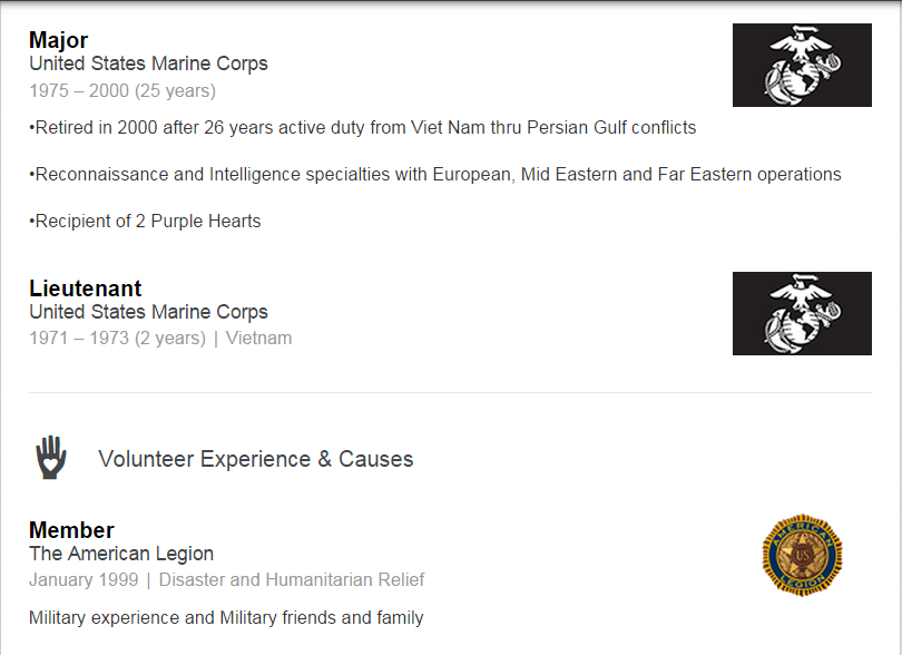 His filled out “DD-214” is quite a fart splat! i.e.; “Officers Training School” at Parris Island?